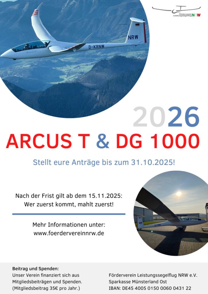 ab sofort könnt ihr den Arcus T 2.0 für die Saison 2026 beantragen. Wir freuen uns über zahlreiche Anträge und versuchen jeden Antrag zu berücksichtigen. Ob für ein Trainingslager, die Streckenflugausbildung, ein Vereinscamp, eine regionale Meisterschaft oder gar ein internationaler Wettbewerb – der Arcus und das Gesamtsystem lassen keine Wünsche offen.